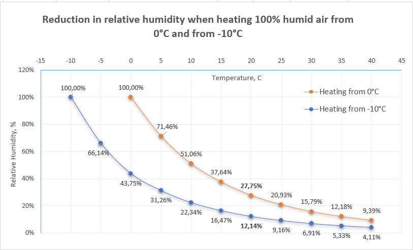 - Sur le graphique 1, on peut voir comment l'humidité relative de l'air diminue rapidement lorsqu'il est chauffé de -10°C (courbe bleue) et de 0°C (courbe orange) à la température ambiante. Notez que dans le premier cas, la zone d'inconfort en termes d'humidité survient déjà à +10°C, tandis que dans le second cas, elle survient à +20°C.