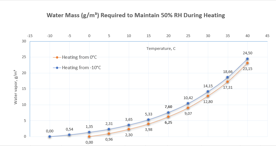 - Le graphique 3 indique combien de grammes de vapeur d'eau doivent être ajoutés par mètre cube d'air lors du chauffage pour que l'humidité reste dans la zone de confort (50%).