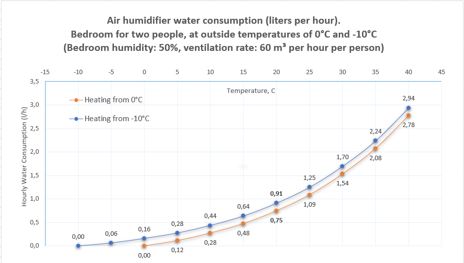 Remarquez que même à une température de 20°C dans la chambre, le confort minimal nécessite une consommation d'eau par l'humidificateur d'au moins 0,75 litre par heure!